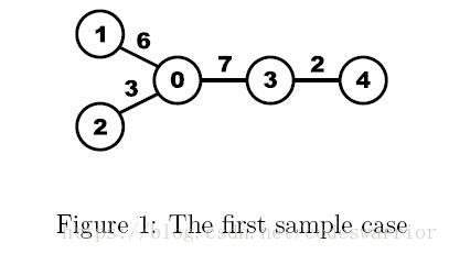 n - 1 lines, each with three integers a (0 <= a < n), b (0 <= b < n) and d (1 <= d <= 1 000). There is an edge between the nodes with numbers a and b of length d. The resulting graph will be a tree.